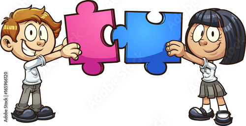 Cartoon students in uniform, holding jigsaw puzzle pieces. Vector clip art illustration with simple gradients. Each on a separate layer. - Buy this stock vector and explore similar vectors at Adobe Stock |